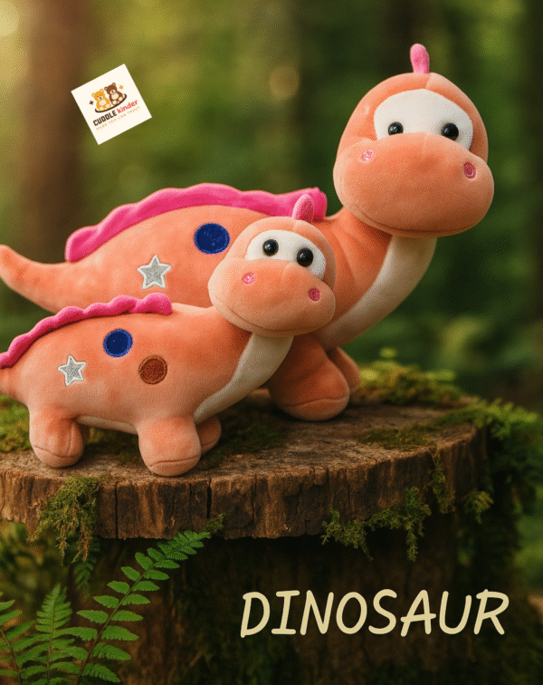 Step back in time to the land of cuddles with our Dino Duo Plush Set! Featuring an adorable parent-and-baby dinosaur pair in soft peach tones with bright pink ridges, these plushies are decorated with colorful embroidered stars and circles for extra charm. Made from ultra-soft fabric, theyโ€™re perfect for snuggling, gifting, or decorating any kidโ€™s room.